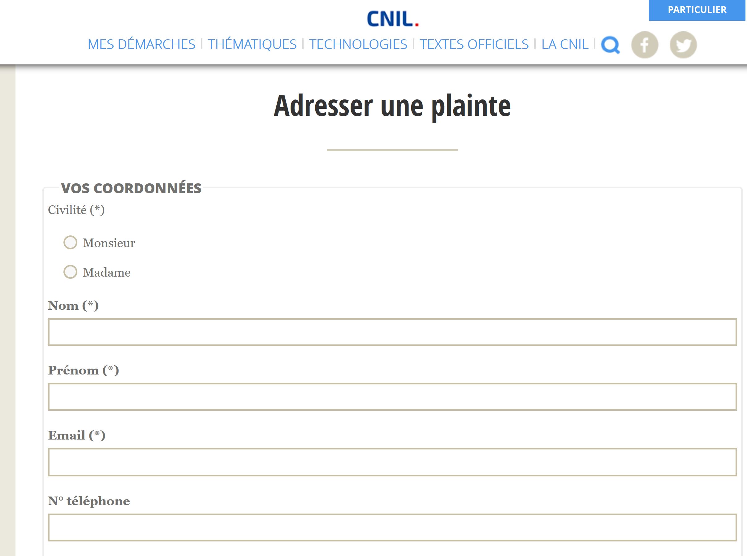 Le système est simplifié via un formulaire accessible très facilement sur https://www.cnil.fr/fr/webform/adresser-une-plainte