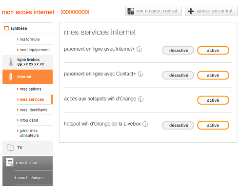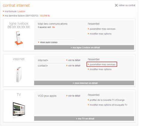 Chez Orange, il faut aller dans « mes contrats » -> « contrat internet » et cliquer sur « paramétrer mes services ».