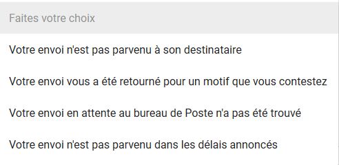 Ensuite, il y a aussi un sous-menu, par exemple pour « situation », la Poste n,ous demande comme à des neuneus ce qui est arrivé:
